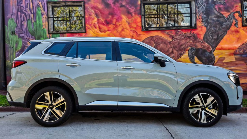 Ya en la vista lateral, esta versión Titanium viene con las manijas de puertas cromadas, llantas de aleación de 19 pulgadas, los marcos de ventanas cromados y las barras de techo en gris satinado. La Territory mide 4.685mm de largo, 1.706mm de alto y 2.177mm de ancho con espejos. El tanque de combustible tiene 60 litros de capacidad y la unidad probada estaba equipada con neumáticos Goodyear Efficient Grip en medida 235/50 R19. La rueda de auxilio es de uso temporario y viene ubicada debajo del piso del baúl.